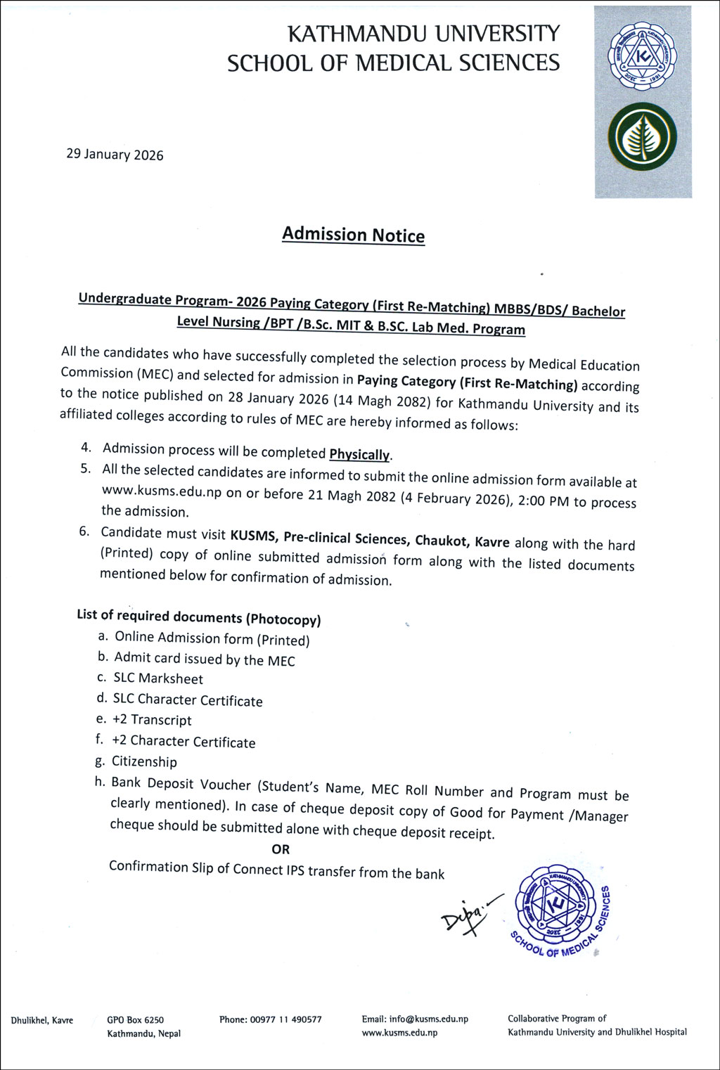 Admission Notice: Undergraduate Program-2026, Paying Category (First Re-Matching) MBBS/BDS/Bachelor Level Nursing/B.Sc. MIT and B.Sc. Lab Med. ProgramJanuary 29, 2026Print (Apply Online -Must Login With Google Account) mbbs program bds Program BNS/BMS Program B.sC nursing program bpt, b.lab med, B.MIT, B.Sc MLT Program