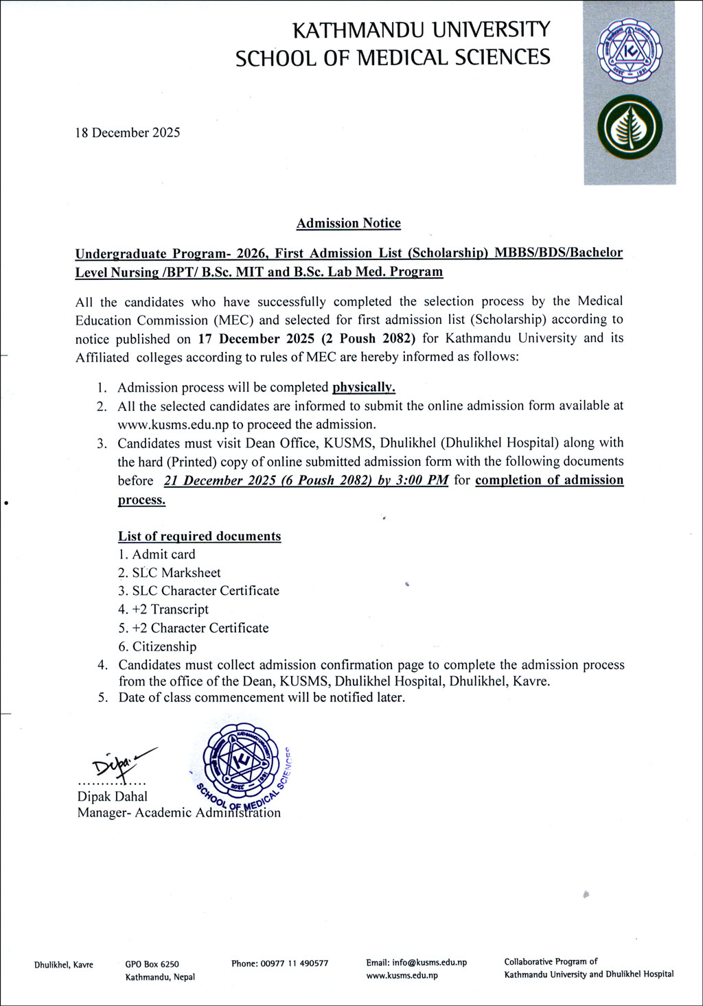 Admission Notice: Ungergraduate Program-2026, First Admission List (Scholarship) MBBS/BDS/Bachelor Level Nursing/B.Sc. MIT and B.Sc. Lab Med. ProgramDecember 18, 2025December 18, 2025Print (Apply Online -Must Login With Google Account) mbbs program bds Program BNS/BMS Program B.sC nursing program bpt, b.lab med, B.MIT, B.Sc MLT Program