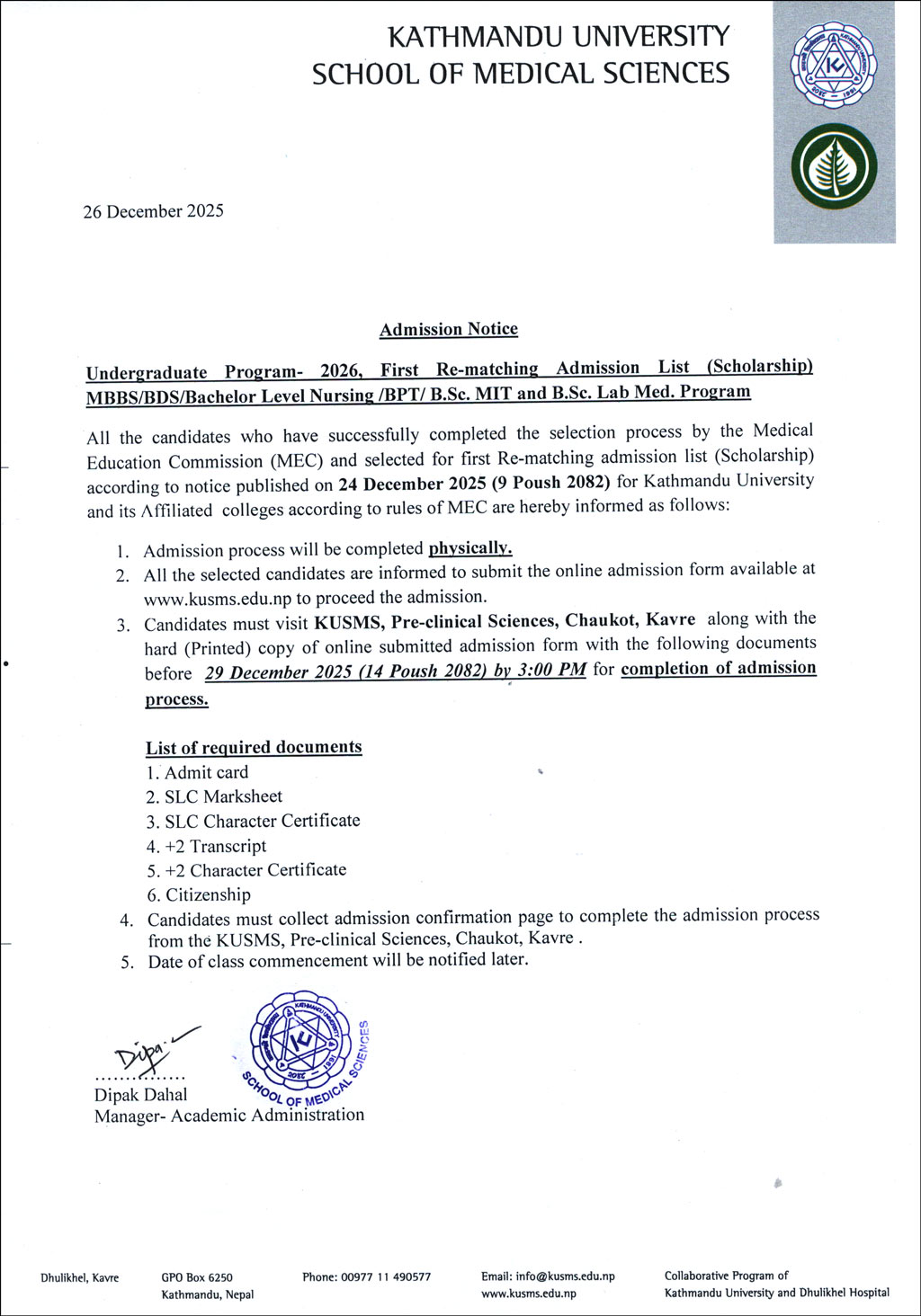 Admission Notice: Ungergraduate Program-2026, First Re-Matching Admission List (Scholarship) MBBS/BDS/Bachelor Level Nursing/B.Sc. MIT and B.Sc. Lab Med. ProgramDecember 26, 2025Print (Apply Online -Must Login With Google Account) mbbs program bds Program BNS/BMS Program B.sC nursing program bpt, b.lab med, B.MIT, B.Sc MLT Program