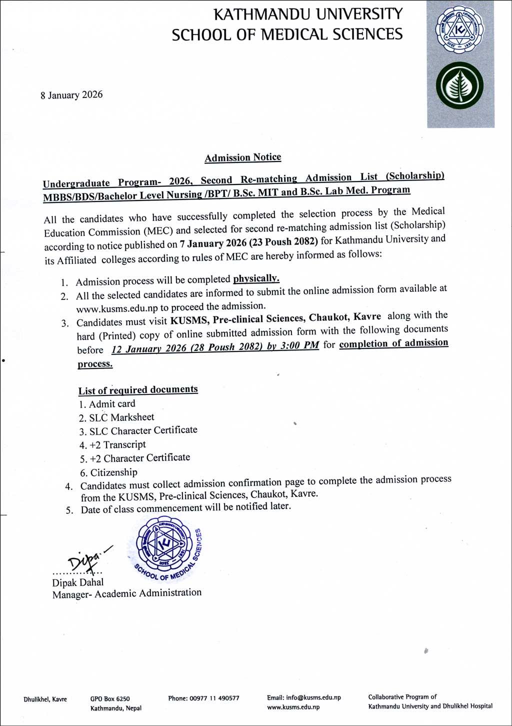 Admission Notice: Ungergraduate Program-2026, Second Re-Matching Admission List (Scholarship) MBBS/BDS/Bachelor Level Nursing/B.Sc. MIT and B.Sc. Lab Med. ProgramJanuary 9, 2026January 9, 2026Print (Apply Online -Must Login With Google Account) mbbs program bds Program BNS/BMS Program B.sC nursing program bpt, b.lab med, B.MIT, B.Sc MLT Program