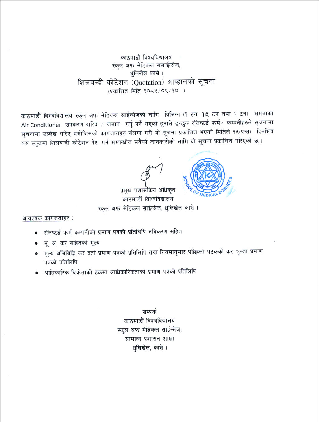 Air Conditioner उपकरण खरिद/जडान को शिलबन्दी कोटेशन आव्हानको सूचनाDecember 26, 2025December 26, 2025Print