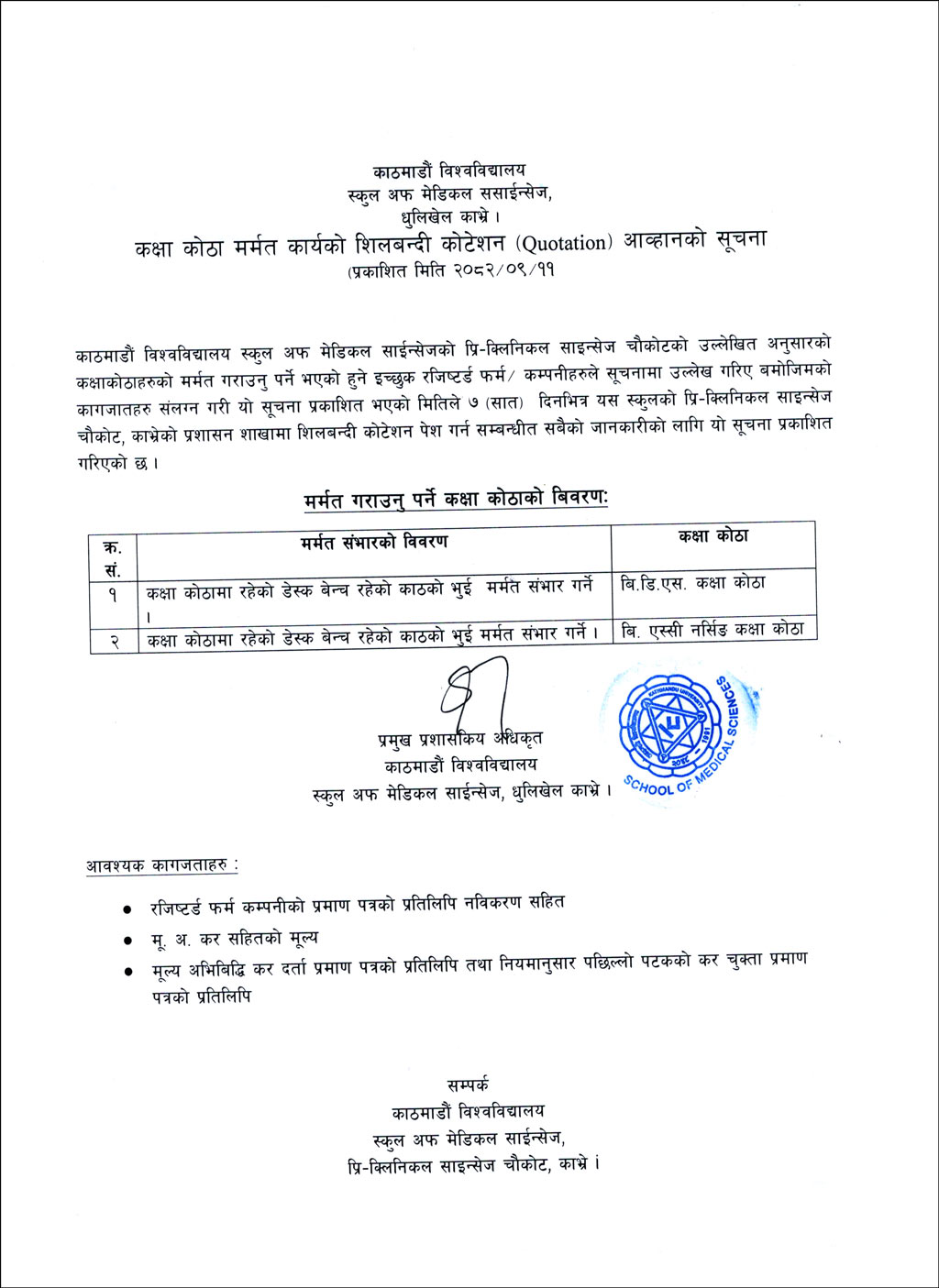 कक्षा कोठा मर्मत कार्यको शिलबन्दी कोटेशन आव्हानको सूचना