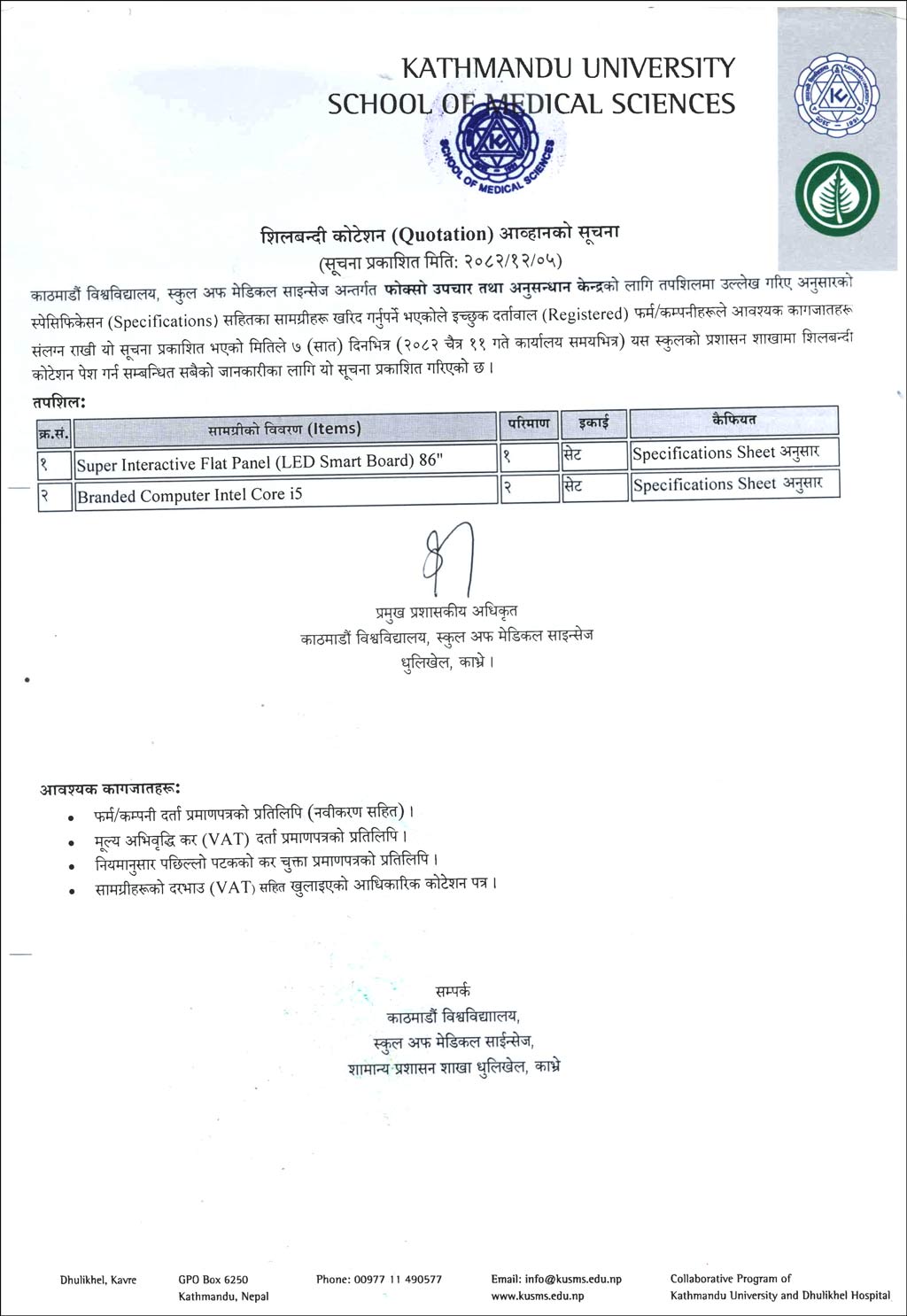 LED Smart Board , Branded Computer Set खरिदको लागि शिलबन्दी कोटेशन आव्हानको सूचनाMarch 20, 2026Print Computer specifications smart board specifications