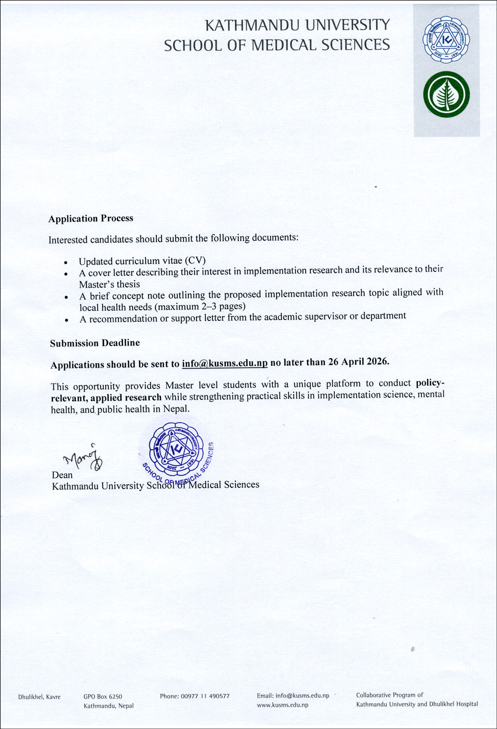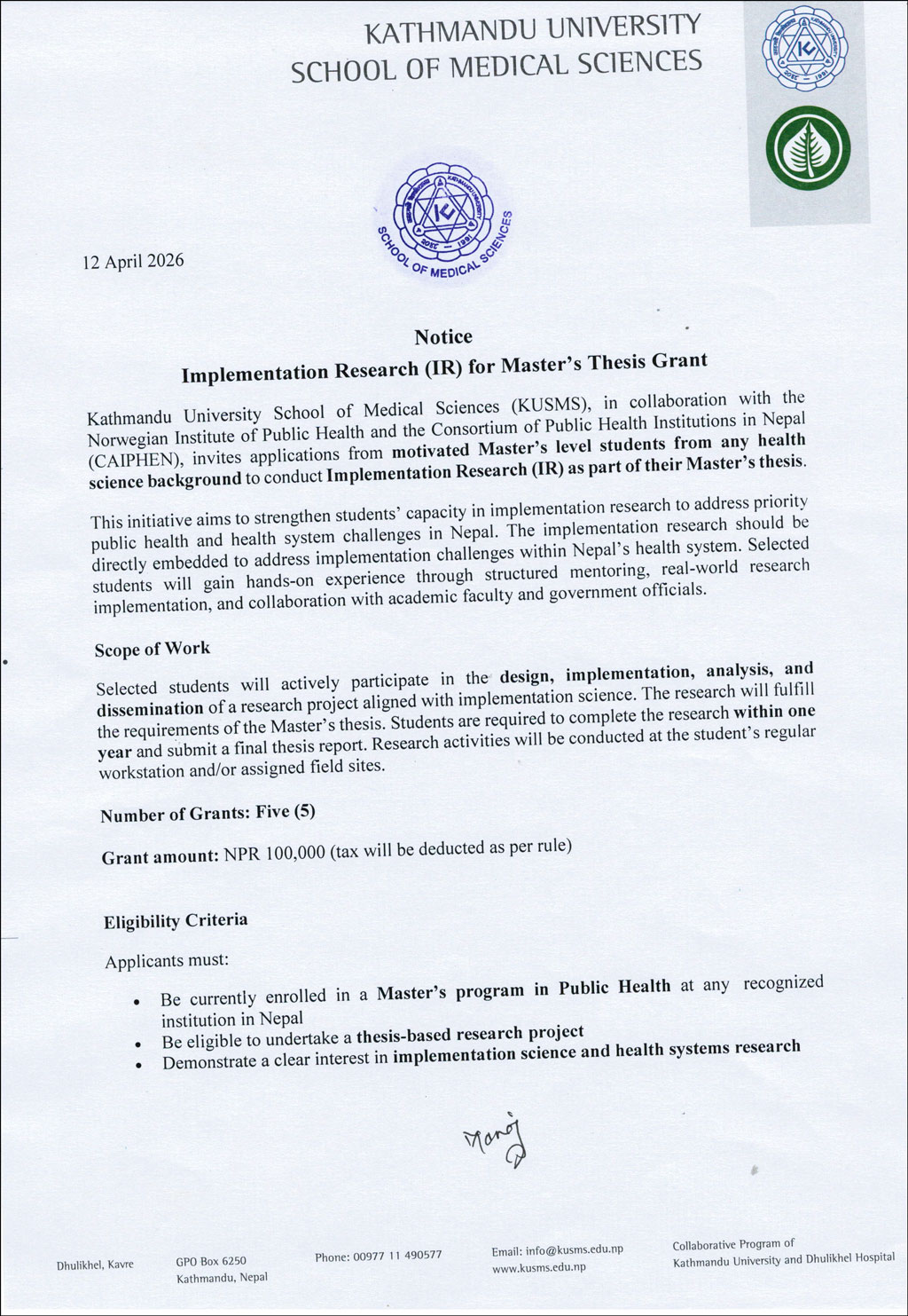 Notice FOr Implementation Research (IR) For Master’s Thesis Grant