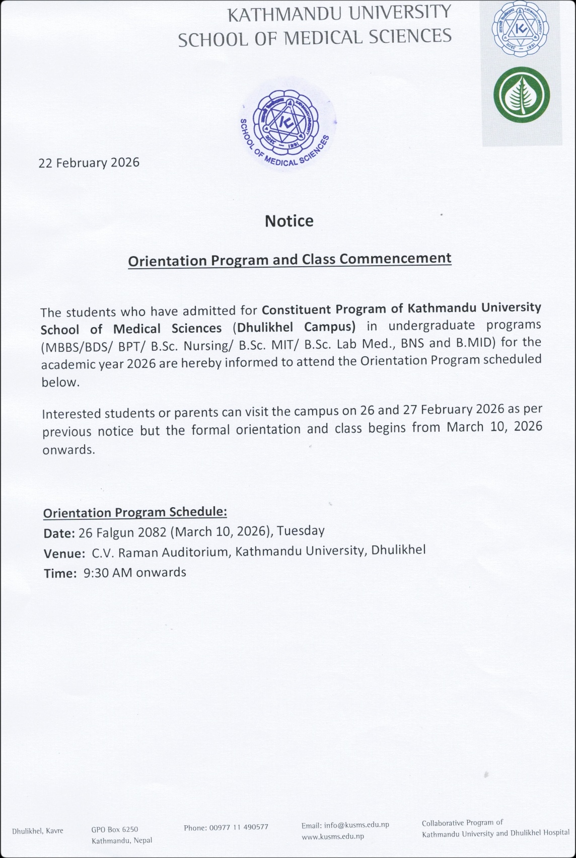 Notice: Orientation Program And Class Commencement For Undergraduate Programs 2026February 22, 2026Print